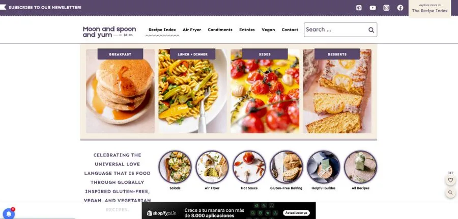 Moon and Spoon and Yum is a charming blog that celebrates food as a creative and nourishing experience. It stands out for its focus on vegetarian, vegan and plant-based recipes, offering delicious options for all palates. From comforting dishes to indulgent desserts, the blog covers a wide range of recipes, all presented with an artistic flair.