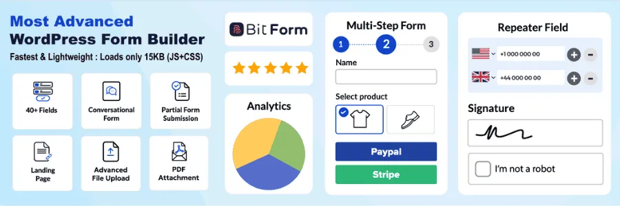 Bit Form adapts perfectly to mobile devices, allowing you to quickly create multi-step forms with drag and drop. With over 10,000 downloads and a five-star rating, it’s a great alternative. It offers over 40 field types, including payment fields and advanced file uploads. It also features numerous integrations, advanced conditional logic, and spam blocking, even without the premium version.