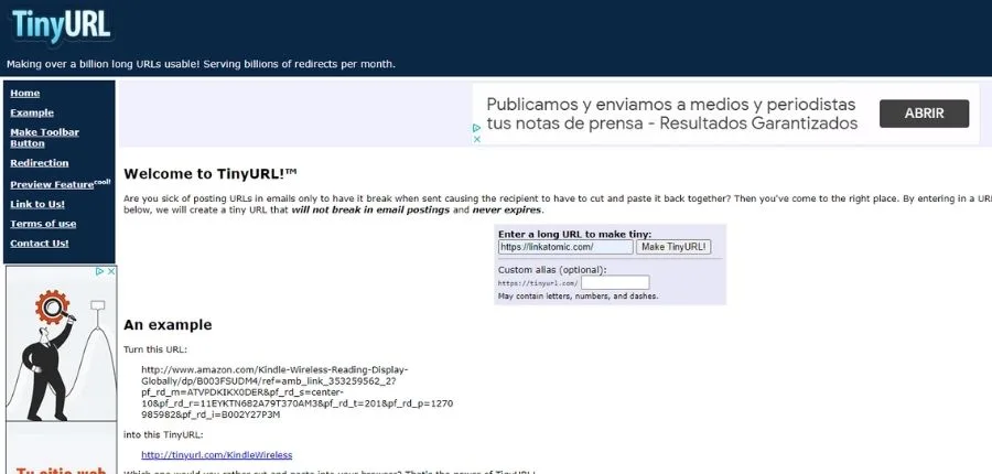 Basta con copiar la URL que quieres transformar y personalizarla si lo deseas. Si no quieres personalizarla, TinyURL se encargará de generar la URL corta sin mayores inconvenientes. Es un sitio web muy popular, ya que miles de millones de enlaces se acortan mensualmente a través de esta herramienta.