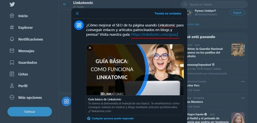 Cada vez que compartes tus enlaces por Twitter, se transformará de inmediato en un enlace de t.co. Incluso, si compartes una URL ya recortada, esta herramienta la transformará para que Twitter pueda recoger datos relevantes y para borrar cualquier indicio de spam o de algún sitio malicioso. Tienes que tener cuenta en Twitter para utilizar la herramienta T.co.