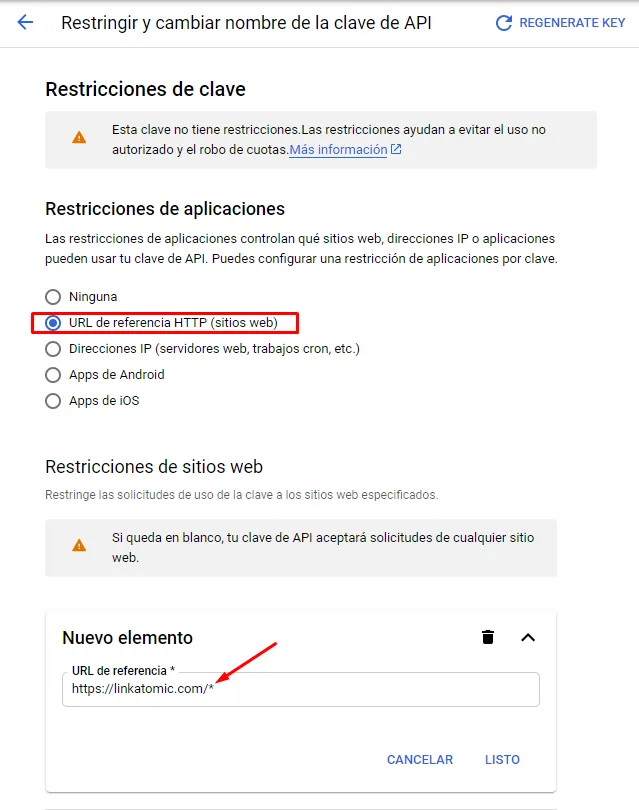 Para evitar sustos en la facturación y proteger nuestra clave API seleccionaremos como restricción de clave una URL de referencia (sitio web) e incluiremos nuestra dirección.