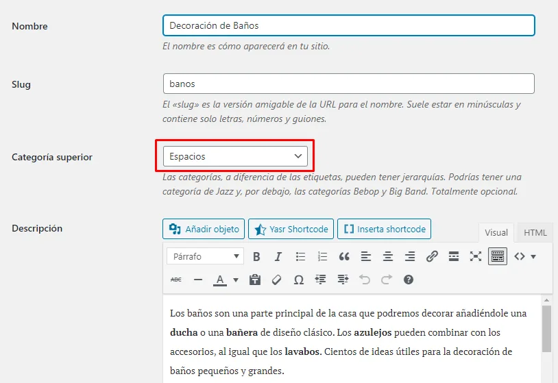 - Categoría superior: Si quieres agrupar una categoría dentro de otra.