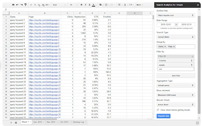 Esta herramienta exportará toda la información de tu página en Search Console a Google Sheets.