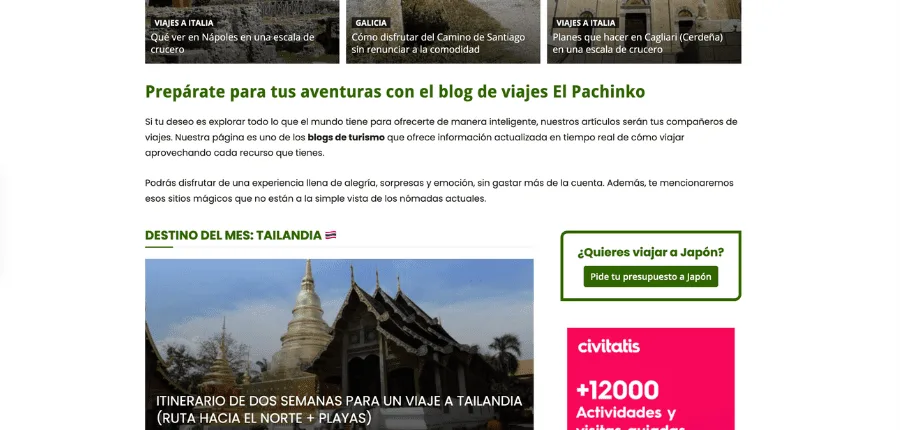 Con 12 años de experiencia, El Pachinko es una de las bitácoras viajeras más influyentes en lengua hispana. Esto es especialmente en temas relacionados con Asia y viajes con niños, sin dejar por fuera que este sitio también proporciona algunos descuentos y ofertas para hospedarte en hoteles de todo el mundo, seguros de viajes, alquiler de coche y reservación de excursiones a cualquier parte del mundo.