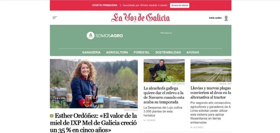 Somos Agro es una sección del reconocido diario La Voz de Galicia especializada en temas de ganadería, agricultura, cuidado forestal, y sostenibilidad del medio ambiente. Si te interesa trabajar estas temáticas, necesitas ver cómo son abordadas aquí con un enfoque principalmente en la educación y la concienciación ambiental. Los lectores aman la información sobre prácticas agrícolas, noticias sobre el sector agropecuario, así como consejos para cuidar nuestro planeta.
