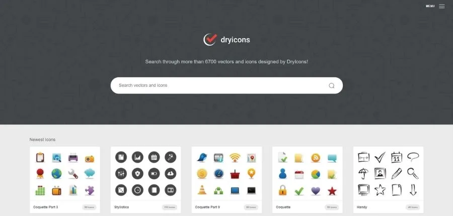 Dryicons tiene en su haber más de 6 mil iconos vectoriales, todos ellos agrupados en 77 paquetes. Si quieres variedad en estilos y diseños, entonces echa un vistazo a esta web. Puedes descargar en formatos que ya son familiares para ti, tales como SVG, PNG y PSD. Es una página bastante ordenada, ya que puedes escoger los iconos seleccionándolos por categorías.