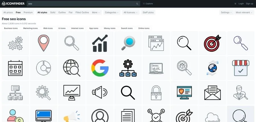 La página web de iconos más grande es Iconfinder y sus más de 5 millones de iconos guardados allí, lo atestiguan. Si quieres iconos gratis, debes saber que más de 2300 diseñadores publican sus trabajos allí diariamente. Esto te da una idea de la amplia variedad que vas a encontrar a la hora de diseñar tu proyecto creativo.