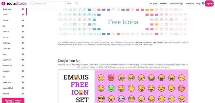 Iconshock es un sitio web enfocado a diseñar iconos gratis agrupados en temáticas específicas. Puedes escoger entre descargar iconos individualmente o por temas, todo ello en formato AI, PNG y SVG. Los iconos son de excelente calidad y con estilos que no has visto en ninguna otra página. Para descargarlos, tienes que registrarte en el sitio web.