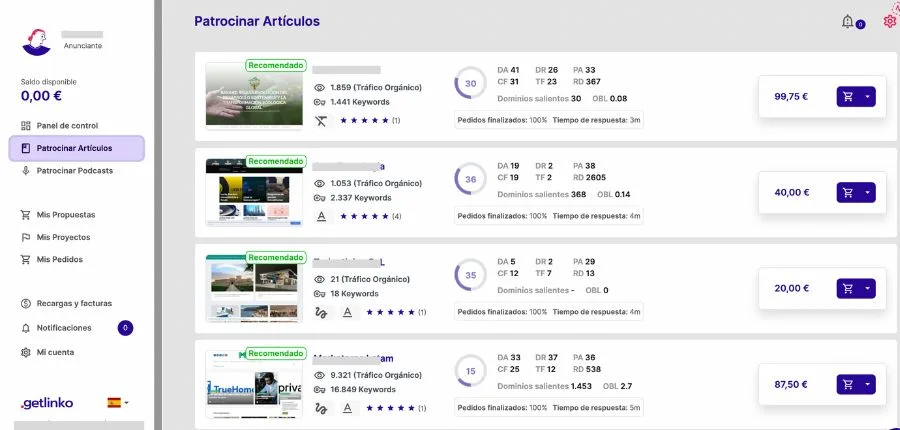 Getlinko es otro marketplace que te permitirá patrocinar artículos en blogs e incluir tus enlaces dentro. Podrás ver las diferentes opciones que admiten los medios, como si existe la posibilidad de entregar tu mismo el artículo que quieras publicar o si se permite insertar links dentro de artículos ya publicados.