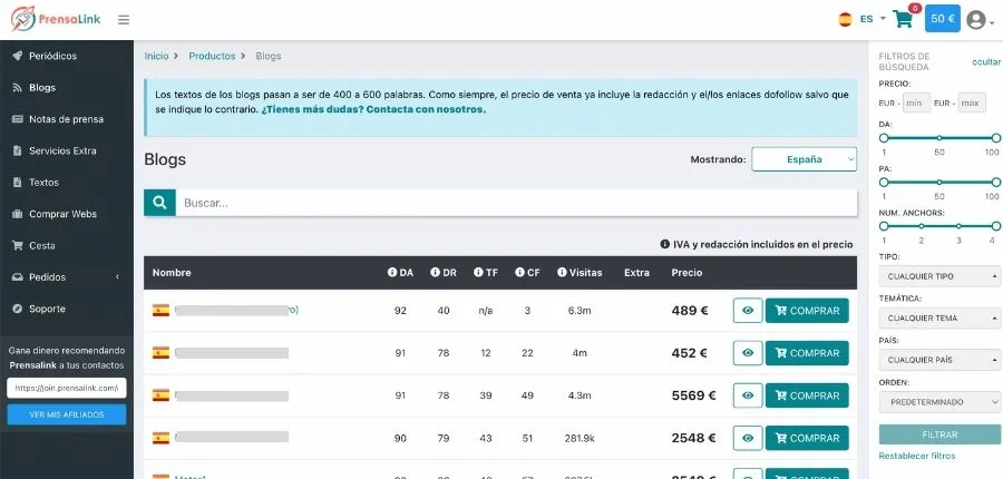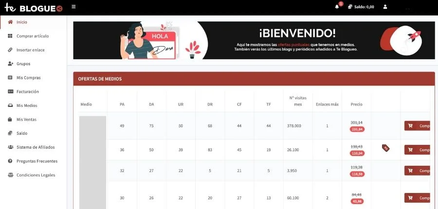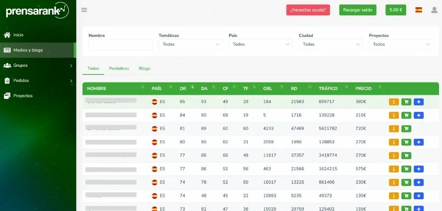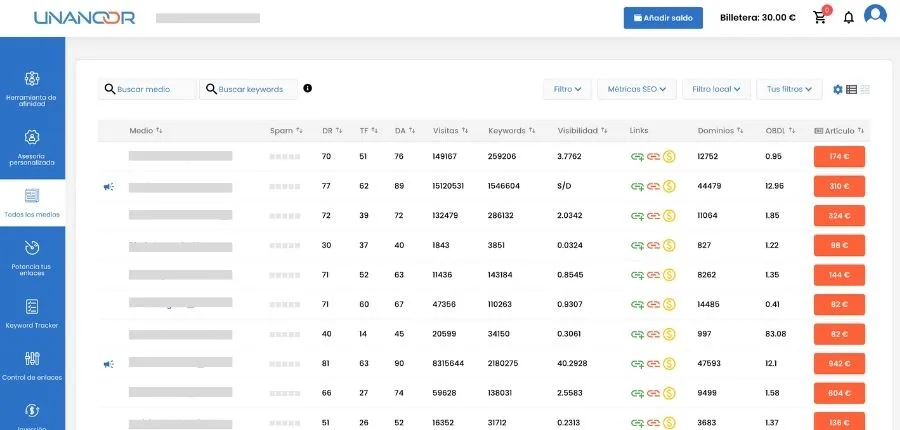 Podrás comprar artículos en más de 2500 medios digitales, visualizando cómodamente todas las métricas de cada sitio, así como las visitas mensuales y enlaces máximos permitidos.