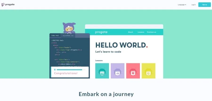 Puedes aprender hasta 9 lenguajes de programación en la plataforma Progate, entre los que se encuentran: JavaScript, jQuery, Ruby, Python, Git, HTML y CSS, entre otros. Entre los 9 cursos de estos lenguajes suman algo más de 40 lecciones, mostrándose el contenido en diapositivas, en vez de vídeos y en texto plano.
