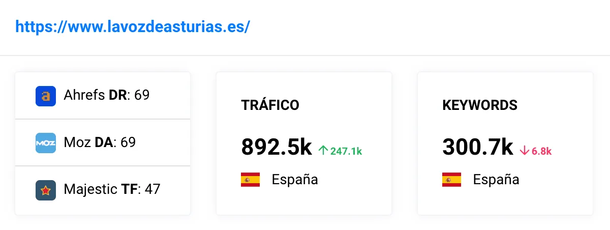Aunque en Linkatomic no trabajamos con el AS de Semrush, sí que tenemos integrado en nuestra plataforma el DR (Ahrefs), TF (Majestic) y DA (Moz) para valorar la autoridad de los portales con los que trabajamos.