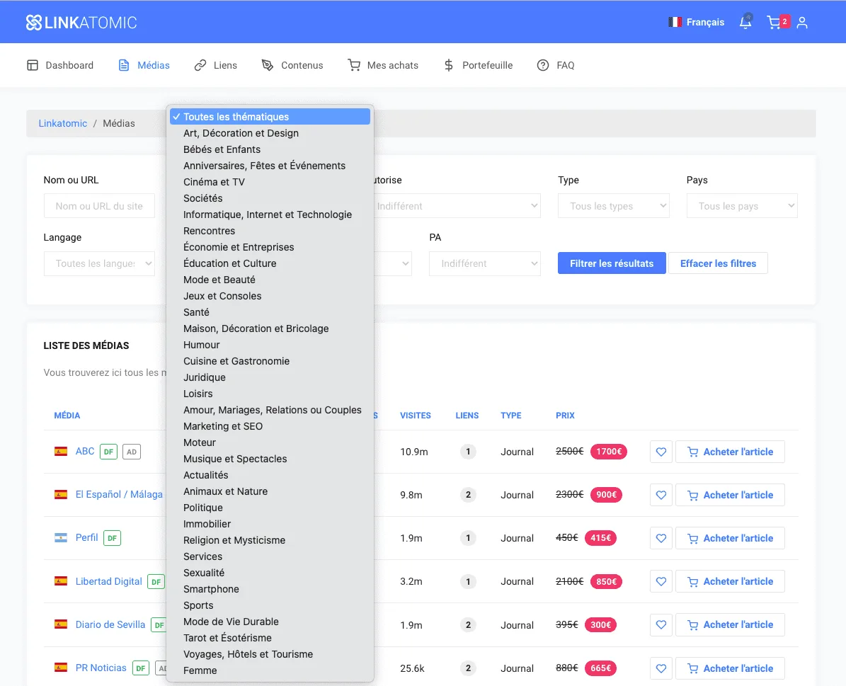 Tu pourras chercher avec des filtres les médias par thématique, langue, métriques ou prix pour trouver le média parfait où sponsoriser ton website ou ton business.
