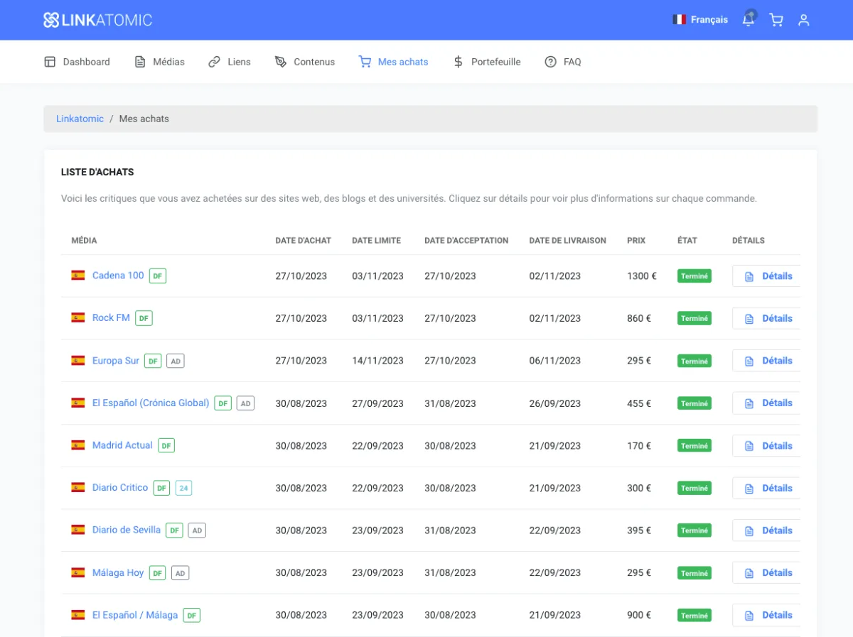 Tu auras aussi d’informations de chaque média, l’adresse de chaque article liée, la date de publication et des autres détails sur chaque commande.