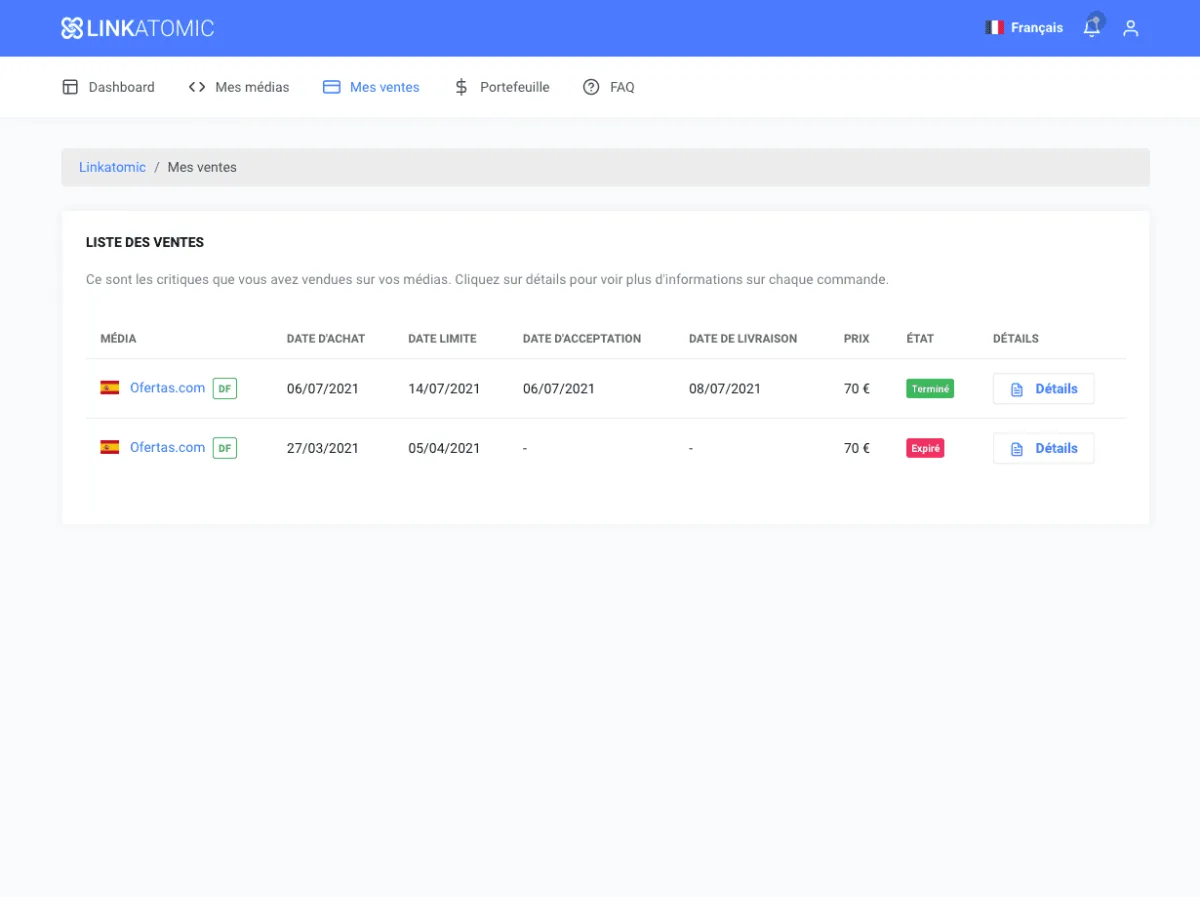 Ici tu trouveras toutes les commandes qui ont été demandées pour publier dans tes médias. Tu auras toute l’information de chaque commande, l’état de chacun, l’argent que tu as gagné avec chaque revue et ses détails.