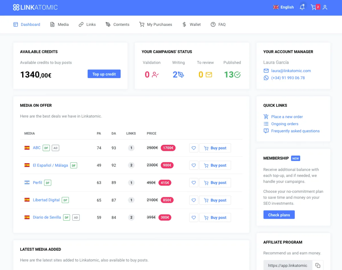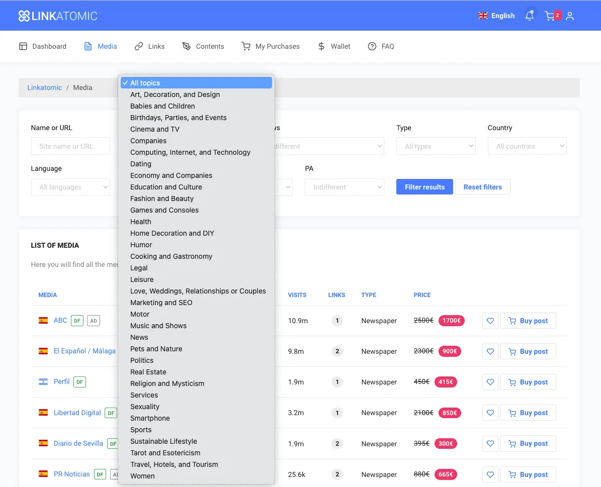 You will be able to filter media by subject, language, metrics or price to find the perfect media to promote your website or business.