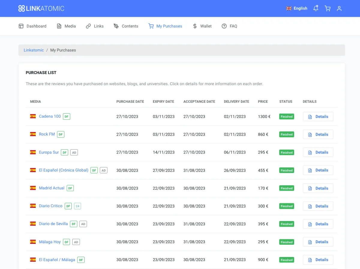 You will be shown information for each media, the address of the article that links to you, the publication date and other details about each order.