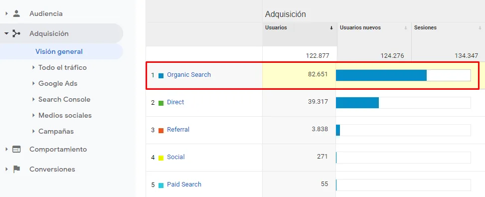 Once you are inside the Google Analytics tool, click on the following path: Acquisition > Channels > Organic Search. As you will see, you have the data concerning how many users have visited your page, and you will also see the quality of those visits.